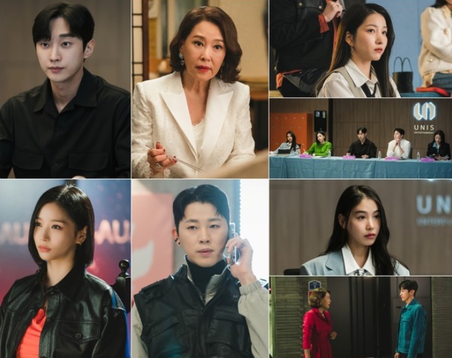 오늘(10일) 공개된 스틸에는 유니스 엔터테인먼트(이하 유니스 엔터)에 모인 진영(대니얼 한 역)과 차화연(김애심 역)을 비롯해 이화겸(임리나 역), 이달(정호이 역), 김소원(서찬미 역), 오지연(권준희 역)의 모습이 공개돼 이목을 집중시킨다.