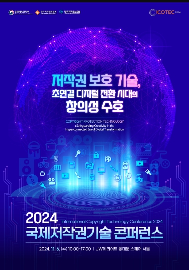 [뉴스서치] 문화체육관광부는 한국저작권위원회, 한국저작권보호원과 함께 11월 6일, 제이더블유(JW) 메리어트 동대문 스퀘어 서울에서 ‘2024 국제 저작권기술 콘퍼런스(ICOTEC, International Copyright Technology Conference)’를 개최한다. 이번 행사는 온라인으로도 생중계하며, 영문 통역도 제공한다.