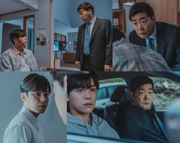 공개된 송판호, 송호영 부자(父子)의 투샷에서는 서로 마주 보고 있어도, 같은 곳을 바라보고 있어도 불안함을 감출 수 없는 이들의 눈빛이 깊은 인상을 남긴다. 사고를 고백하며 자책하는 송호영과 그런 그를 비장하게 바라보는 송판호는 생존을 위해 한없이 처절해질 한 명의 인간이자 아버지로서의 모습이 엿보여 눈길을 사로잡는다.