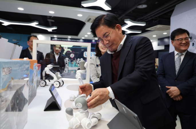 ▲ 2일 상암 DMC 첨단산업센터 소재 로봇기업 '제이엠로보틱스'를 방문해 모듈 토이 로봇을 체험하는 박강수 구청장 |