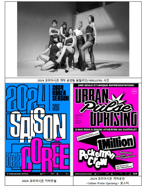 먼저 5월 2일, 파리 샤틀레 극장에서 한국과 프랑스 브레이킹 합동 공연 '어번 펄스 업라이징(Urban Pulse Uprising)'으로 ‘2024 코리아시즌’ 개막을 알린다. ‘파리올림픽’이 브레이킹을 정식 종목으로 채택한 것을 계기로, 한국의 댄서이자 안무가 리아킴이 이끄는 원밀리언(1MILLION)과 프랑스의 포케몬 크루(Pockemon Crew)가 경연(배틀) 형식의 공연을 펼친다.