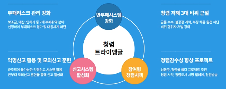 성동구는 지난해 국민권익위원회 주관 종합청렴도 평가에서 2등급을 달성했으나 이에 안주하지 않고 올해는 종합청렴도 평가 1등급 달성을 목표로 빈틈없는 청렴 정책 추진에 나선다. 특히, ‘부패 제로화’ 달성을 위한 시책 마련에 중점을 두고 '청렴 트라이앵글'을 구축했다.