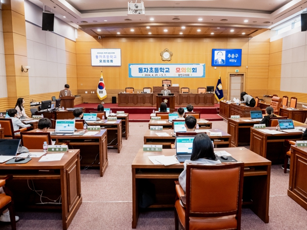 지방의회 체험을 통해 지방의회의 역할과 기능을 이해하고 성숙한 민주시민 의식을 함양할 수 있는 교육의 기회를 제공하기 위해 마련된 ‘2024년도 어린이 모의의회’에는 동자초등학교 6학년 학생 18명이 참여했다.