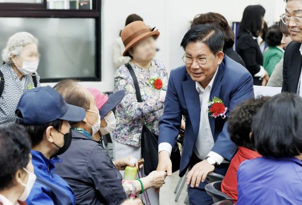 ▲ 어버이날 기념 어르신과의 동행 행사에 참석해 어르신들에게 인사를 전하고 있는 박강수 마포구청장 |