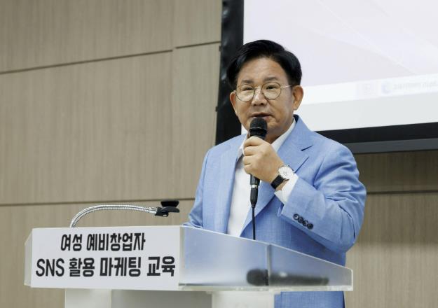 | ▲ 경력단절 여성 등 여성 예비창업자를 대상으로 한 SNS 활용 마케팅 릴레이 특강이 진행돼 박강수 마포구청장이 인사말을 하고 있다. |