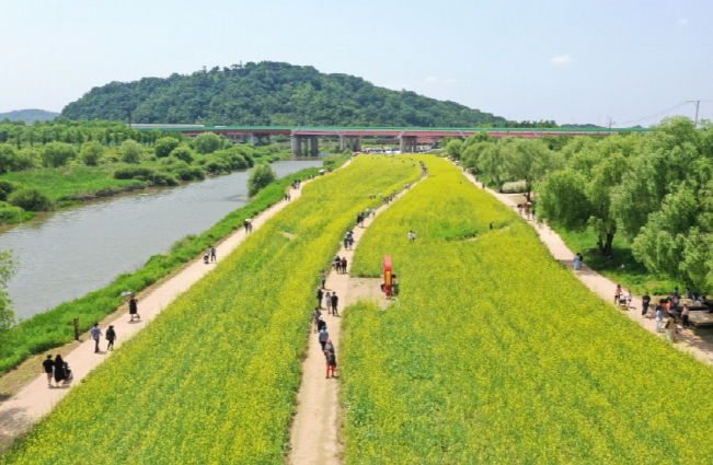 유채꽃을 즐길 수 있는 보행로와 편의시설도 지난해보다 늘어났다. 공원 내 보행로는 이동동선에 따라 흙콘크리트로 평탄하게 정비해 먼지 발생을 차단하고 유모차 이용객이나 노약자도 안전하게 구경할 수 있도록 했다. 진출입로에는 이동식 공공화장실 2개소가 마련돼 쾌적하게 이용할 수 있다. 야간에도 유채꽃을 즐길 수 있도록 구간마다 공원등도 설치했다.