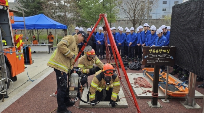 맨홀에서 산소부족으로 작업자가 의식을 잃고 쓰러졌다는 가정하에 훈련이 이뤄졌다. 훈련은 ▲맨홀 내 산소 및 가스농도 측정 ▲산소공급장치 등 구조장비 준비 ▲사고자 인양 등의 응급 구조 활동 순으로 진행됐다.