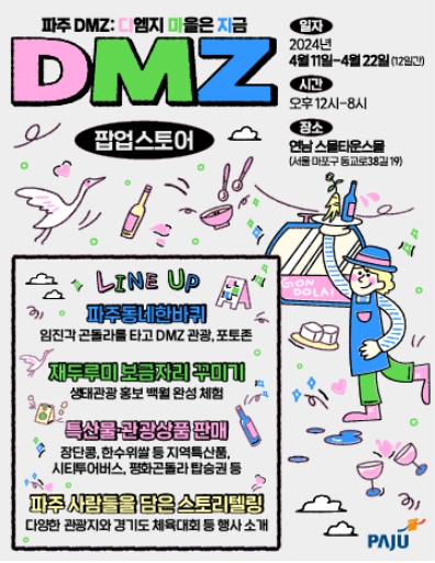 [뉴스서치] 파주시는 4월 11일부터 22일까지 서울 연남동에서 디엠제트(DMZ)를 주제로 한 ‘파주관광 번개장터(팝업스토어)’를 개최한다.