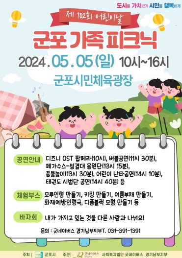 [뉴스서치] 군포시는 오는 5월 5일 어린이날에 2024 어린이날 행사 ‘군포 가족 피크닉’ 을 군포시민체육광장에서 개최한다.