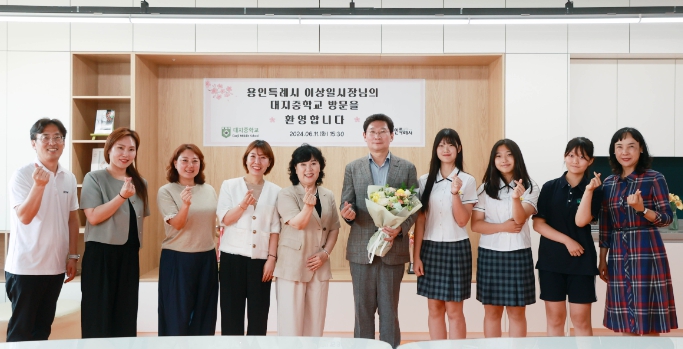 ▲ 이상일 용인특례시장이 11일 대지중학교 관계자들과 기념촬영을 하고 있다 |