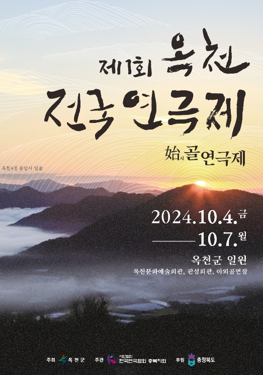 10월 4일부터 7일까지 진행되는 제1회 옥천 전국연극제는 옥천우수마당극, 우수초청연극, 아동극 등의 공연뿐만 아니라 4일에는 연극제 세미나, 5일에는 제17회 옥천예술제가 함께 펼쳐져 풍성한 행사로 관람객들을 맞이할 계획이다.