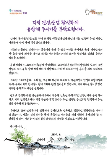 [뉴스서치] 김해시는 대동첨단일반산업단지 기업체에 시장 서한문을 발송해 지역 건설산업 여건 개선에 동참을 당부했다.