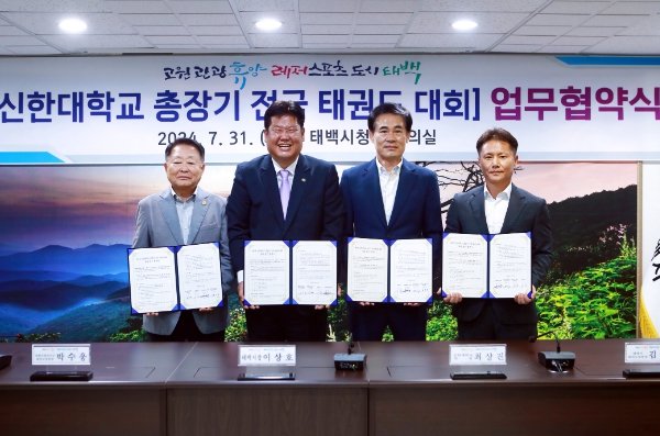 [뉴스서치] 태백시는 지난 7월 31일 태백시청 소회의실에서 신한대와 강원특별자치도태권도협회, 태백시태권도협회와 함께 ‘제4회 신한대학교 총장기 전국 태권도 대회’개최를 위한 업무협약을 체결했다.