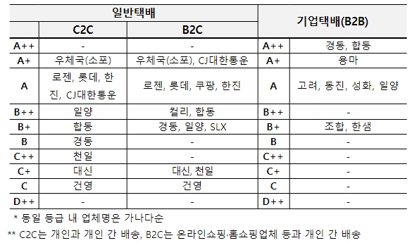 B2C(기업 → 개인) 부문에서는 ‘우체국(소포)’과 ‘CJ대한통운’이 가장 높은 등급(A+)을 받았다. ‘쿠팡CLS’ 등 4개 업체가 다음으로 높은 등급(A)을 받았다.