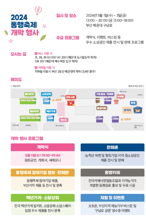 5월 1일부터 3일까지 메인 행사장인 구남로 광장(해수욕장에서 해운대역 방면)에서 동행제품 전시·판촉 부스, 농축수산물마켓, 버스킹공연·이벤트 행사 등을 통해 3일간 살거리·볼거리·즐길거리가 풍성한 축제가 열린다.