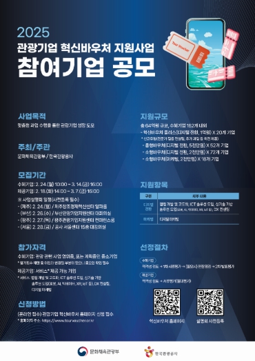 [뉴스서치] 문화체육관광부는 관광중소기업의 디지털 전환을 돕기 위해 한국관광공사와 함께 2월 24일부터 3월 14일까지 ‘2025년 관광기업 혁신바우처 지원사업’ 참여기업 160여 개를 공모한다.