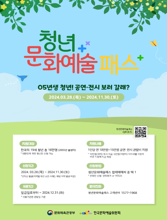 [뉴스서치] 문화체육관광부는 한국문화예술위원회와 함께 3월 28일 오전 10시부터 협력예매처인 ‘인터파크’와 ‘예스24’를 통해 ‘청년 문화예술패스’ 신청을 받는다.