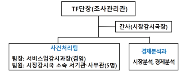 TF는 조사관리관(TF 단장) 산하에 신설되는 전담 사건처리팀과 경제분석과가 유기적으로 협조하는 체제로 구성됐다. 사건처리팀은 직원(서기관·사무관) 5명을 배정하여 배달플랫폼 사건만 전담하여 처리토록 하고, 경제분석과는 사건처리팀과 함께 주요 행위에 대한 심도 있는 경제분석을 진행할 예정이다.