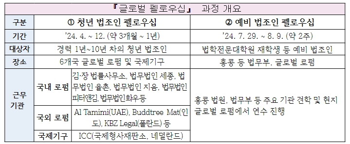 [뉴스서치] 법무부가 대한변호사협회와 함께 국내외 글로벌 로펌, 국제기구 등과 협력하여 새롭게 준비한 ‘글로벌 펠로우십’은 우수한 대한민국 청년 법조인들의 국제법무 경쟁력 강화를 위한 해외연수 과정으로, ① 청년 법조인 펠로우십과 ② 예비 법조인 펠로우십으로 구성되어 있다.