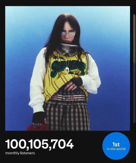 오늘(21일) 유니버설뮤직은 “지난 5월 17일 세 번째 정규앨범[히트 미 하드 앤드 소프트(HIT ME HARD AND SOFT)]를 발매한 빌리 아일리시가 이번에 스포티파이 월 청취자 수를 1억 명이나 돌파했다”라며 “플랫폼 역사상 월 청취자 수를 1억 명을 넘긴 것은 총 3명뿐이며 빌리 아일리시는 이 중 최연소”라고 의의를 전했다.