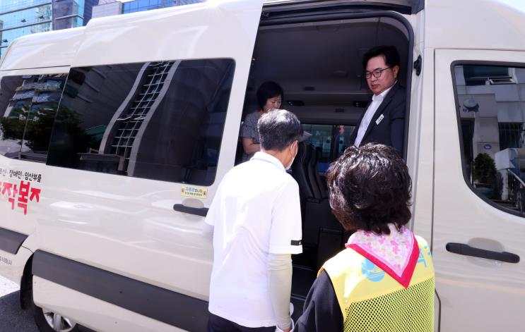 ▲ 박일하 동작구청장(사진 오른쪽 상단)이 교통약자 이동 편의 증진을 위해 운영 중인 동작복지카를 이용하는 어르신의 탑승을 돕고 있다 |