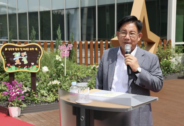 ▲ 박강수 마포구청장이 마포구보건소 2층 야외공간에서 열린 햇빛센터 '꽃길' 준공식에 참석해 기념사를 전하고 있다. |