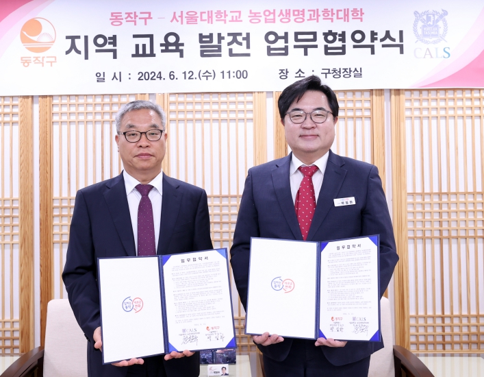 구는 지난 12일 동작구청에서 박일하 동작구청장을 비롯해 장판식 학장 등 주요 관계자들이 참석한 가운데 동작구-서울대학교 농업생명과학대학 간 지역 교육 발전을 위한 업무협약(MOU)을 체결했다며 이같이 밝혔다.