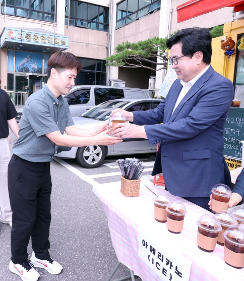 ▲ 박일하 동작구청장이 민선8기 2주년을 맞아 직원들에게 커피를 나눠주고 격려의 말을 전하는 커피차 이벤트를 실시했다 |