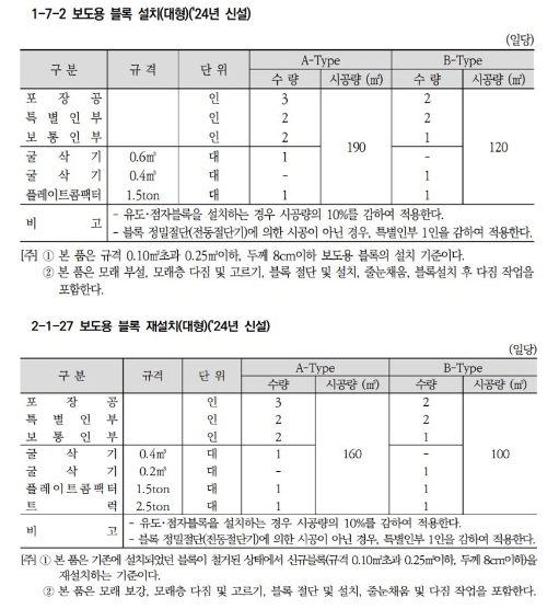 ▲ 2024 건설공사 표준품셈에 신설된 대형보도블록 설치·재설치 기준 |