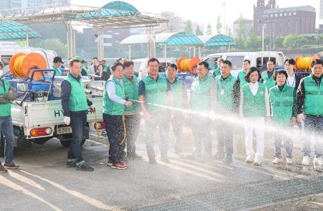 이날 박강수 마포구청장은 대원들에게 격려사를 전하고 방역 장비를 직접 시연해보는 시간을 가졌다.
