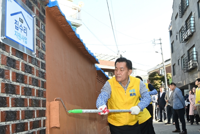 ▲ 이재준 수원시장이 지난해 10월 수원형 저층주거지 집수리 지원사업 1호 기념식에서 페인트를 칠하고 있다. |