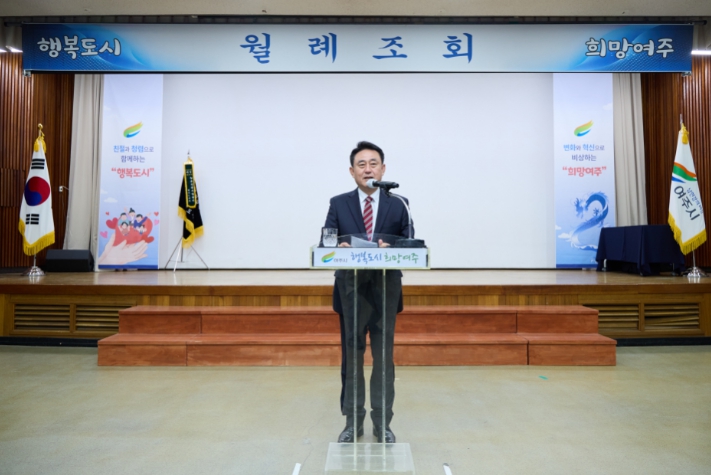 월례조회는 ‘제36회 여주도자기 축제 홍보 영상’ 시청, 국민의례, 시상, 훈시, 여주의 노래 제창 등의 순으로 진행됐으며 이충우 시장은 수상자들에게 축하 인사와 함께 성과를 창출한 공무원의 노력에 대해 감사 인사를 전했다.