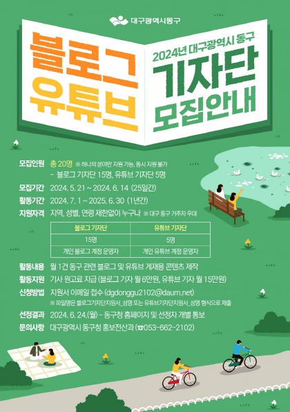[뉴스서치] 대구 동구청은 오는 6월 14일까지 동구 소식지 ‘팔공메아리’ 명예기자와 제12기 동구 블로그 기자단 그리고 제2기 유튜브 기자단을 모집한다.