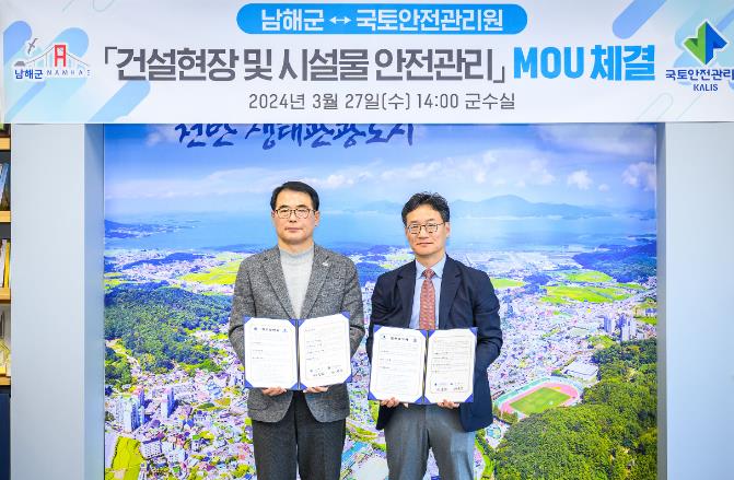 [뉴스서치] 남해군과 국토안전관리원은 27일 남해군청에서 ‘건설현장 및 시설물의 건설안전 확보를 위한 업무협약(MOU)’을 체결했다.