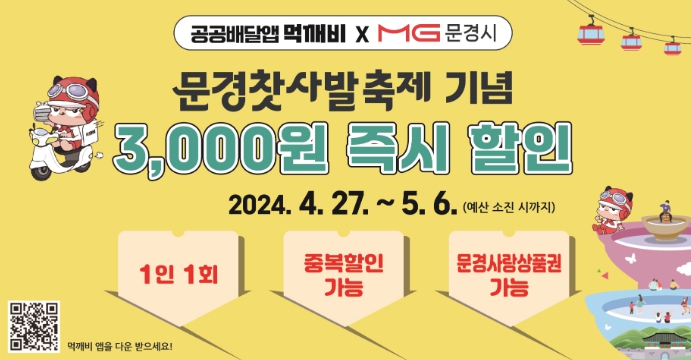 문경찻사발축제 개최를 기념하여 3,000원 할인 쿠폰을 발행하며, 먹깨비 앱에서 1만2000원 이상 주문 시 1일 1회 사용이 가능하다.