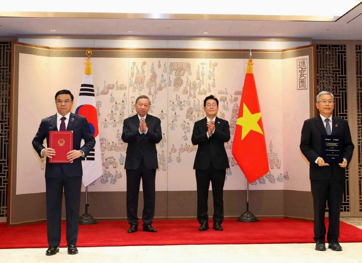 ▲ 한전-PVN MOU사진 (왼쪽부터 베트남 PVN 회장 레 마잉 훙 / 베트남 공산당 서기장 또 럼 / 대한민국 대통령 이재명 / 한국전력 사장 김동철) |