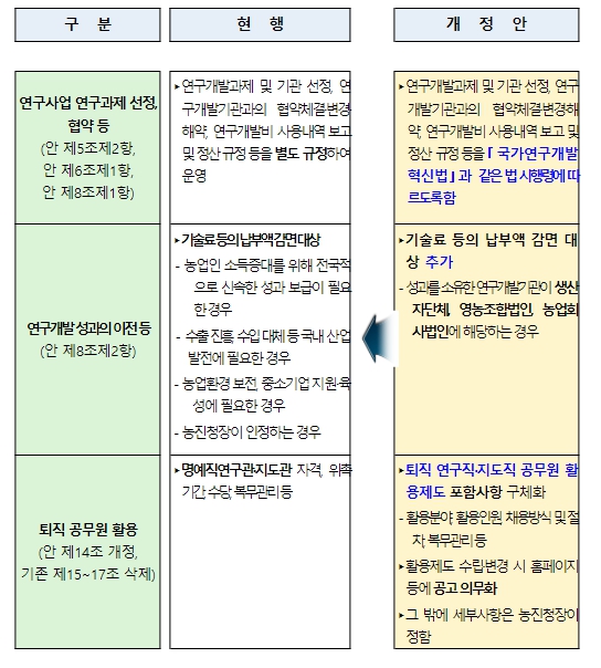 또한, 2021년부터 시행되고 있는 ‘국가연구개발혁신법’과 기존 ‘농촌진흥법’을 일치시켜 농촌진흥청이 국가연구개발사업을 통합·체계적으로 운영할 수 있도록 개정했다.