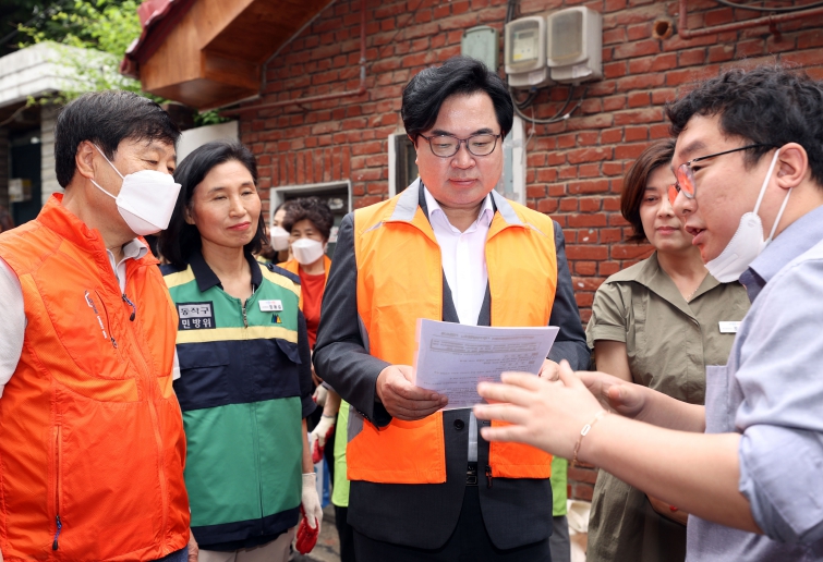 ▲ 지난 30일 박일하 동작구청장이 관내 저장강박 의심가구 주거환경개선 현장을 찾아 진행상황을 점검하고 있다 |