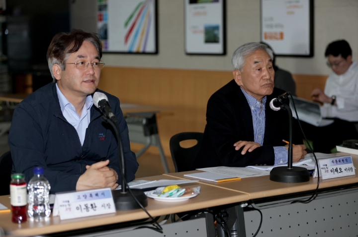 ▲ 창릉천 용역 중간보고회에서 이동환 고양특례시장(좌), 이재오 자문위원장(우) |