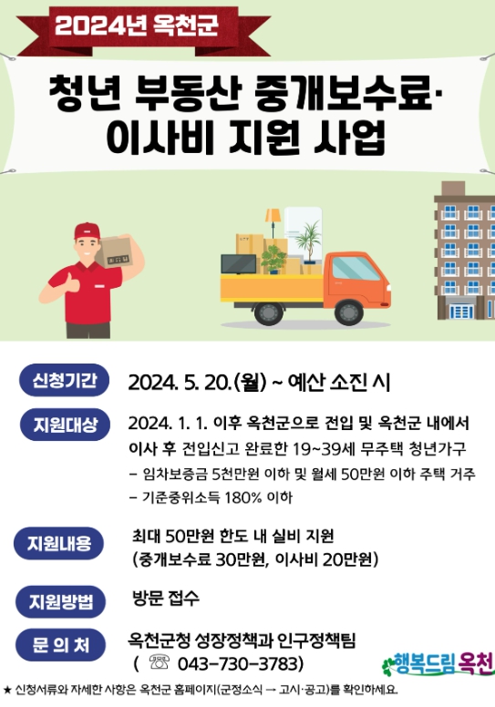 [뉴스서치] 옥천군에 사는 청년이라면 올해부터 이사비와 중개보수료를 지원받는다.