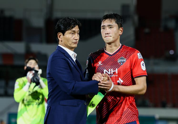 ▲ 지난 28일 서울전에서 김천상무 정정용 감독과 원두재가 경기 후 인사를 나누고 있다 |