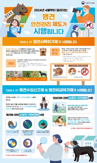 [뉴스서치] 농림축산식품부는 맹견사육허가제, 반려동물 행동지도사 국가자격제, 동물복지축산 인증 등 「동물보호법」 개정 사항이 올해 4월 27일부터 시행된다고 밝혔으며, 새롭게 시행되는 내용은 다음과 같다.