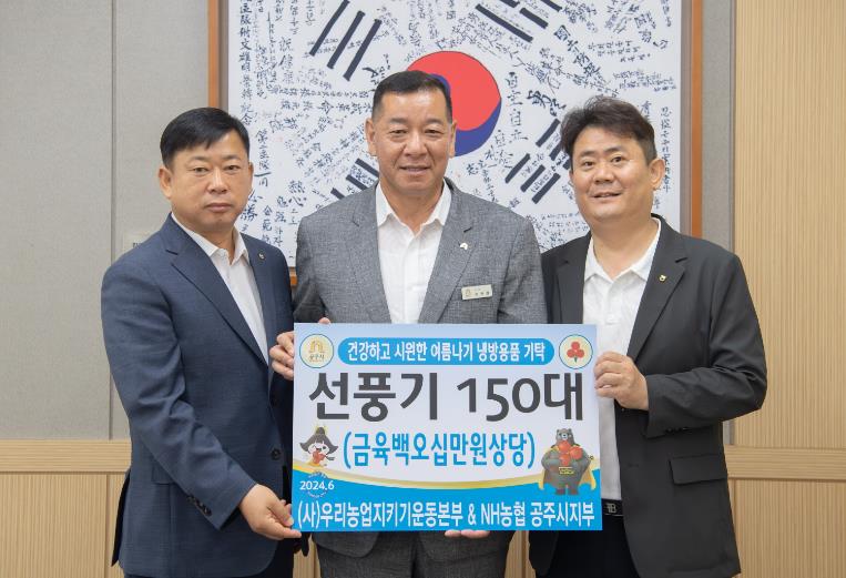 이기범 (사)우리농업지키기운동본부 충남세종지역본부장과 황광환 NH농협공주시지부장 등은 이날 시청을 방문해 최원철 시장에게 선풍기 150대(650만원 상당)를 전달했다.