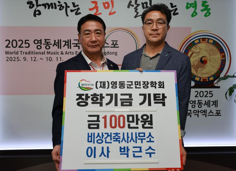 [뉴스서치] 비상건축사사무소 박근수 이사가 지난 26일 영동군을 찾아 (재)영동군민장학회에 100만원의 장학금을 맡겼다.