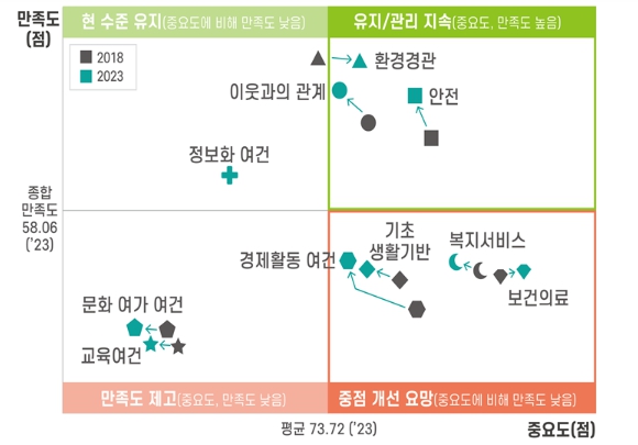 도시와 농어촌의 생활 부문별 중요도와 만족도를 통한 아이피에이(IPA) 분석 결과, 2018년과 2023년 모두 농어촌의 보건의료, 복지서비스, 기초 생활 기반, 경제활동 여건이 중요도와 비교해 만족도가 낮아 개선이 필요한 것으로 나타났다.