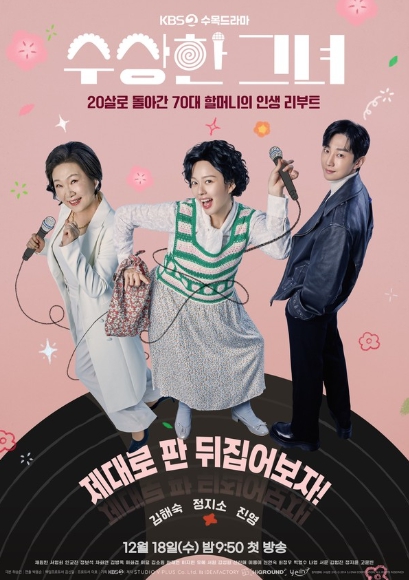 오는 12월 18일(수) 첫 방송 예정인 KBS 2TV 새 수목드라마 ‘수상한 그녀’(연출 박용순/ 극본 허승민/ 제작 스튜디오브이플러스, 아이디어팩토리, 하이그라운드, 예인플러스)는 할머니 오말순이 하루아침에 스무 살 오두리로 변하게 된 뒤 다시 한번 빛나는 전성기를 즐기는 로맨스 음악 성장 드라마다.