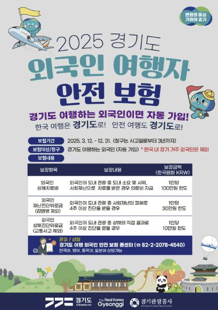 보다 안전한 도내 여행 환경을 조성하기 위해 출시한 이번 보험은 경기도 관광 중 시위와 같은 사회재난 및 상해를 입은 경우에 한해 보장한다. 경기도를 여행하는 외국인(국내 장기 거주 외국인 제외)이면 별도 신청 절차 없이 자동 가입되며, 증빙 자료를 제출하면 혜택을 받을 수 있다. 보장 항목은 ▲상해치료비(1인당 100만원 한도) ▲재난진단위로금(감염병 제외/1인당 30만원 한도) ▲상해진단위로금(교통사고 제외/1인당 10만원) 등이다.
