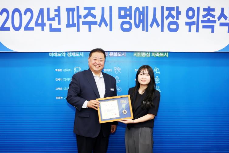 [뉴스서치] 파주시는 22일 적성융합고등학교 학생회장인 김승비 학생을 제29대 일일 명예시장으로 위촉했다.