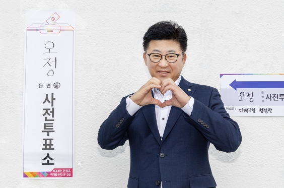 ▲ 최충규 대덕구청장이 5일 대덕구청 청렴관 사전투표소 앞에서 제22대 국회의원 선거 사전투표를 완료한 후 기념 촬영을 하고 있다. |