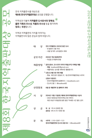 공모방법은 7월 2일까지 신청서와 도서 표지 이미지 파일을 이메일로, 도서는 1종당 5권씩 우편으로 제출하면 되며, 자세한 사항은 한국지역출판연대 사무국 또는 인스타그램으로 문의하면 된다.